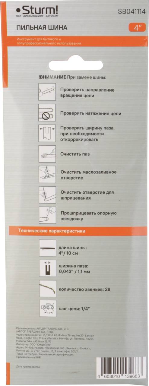 Аксессуар для садового инструмента STURM! Шина для цепных пил SB041114 1/4" 28звен. для CSC12/1204/1204C