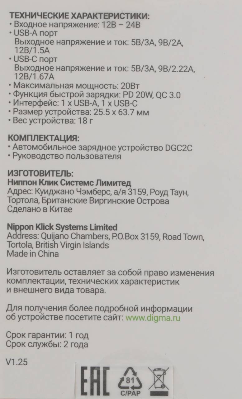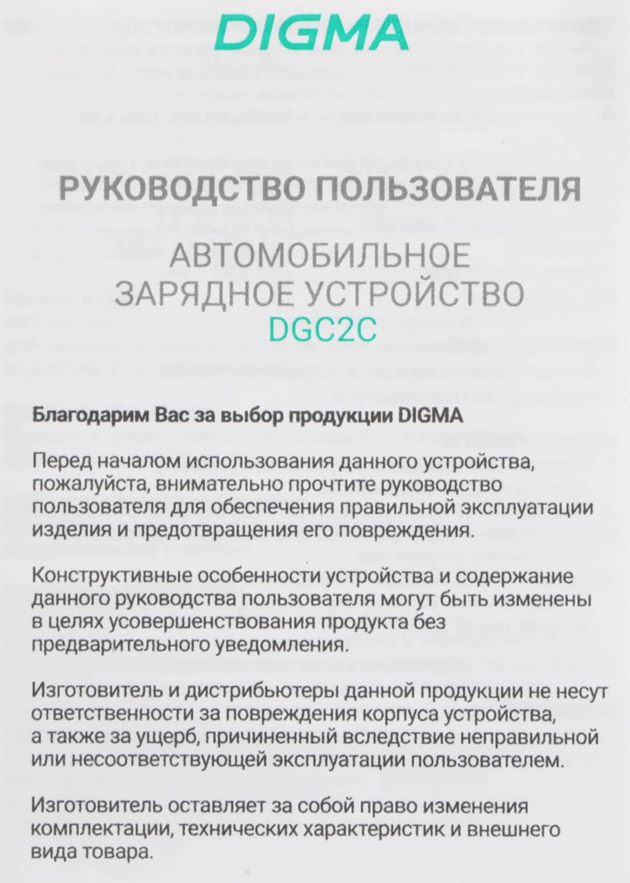 Автомобильная зарядка для устройств Digma Автомобильное зар./устр. DGC2С 20W 3A