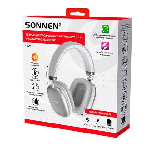 Беспроводные наушники SONNEN Наушники беспроводные накладные полноразмерные раздвижные мультирежимные, HP-B12S, Bluetooth 5.4, серебристые, 514127