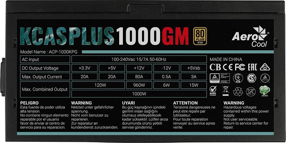 | Описание: | Блок питания AeroCool ATX 1000W KCAS-1000GM 80+ bronze APFC 120mm fan 10xSATA RTL (ACPG-KPK0FEC.11) |