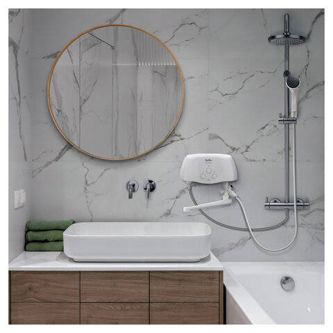BALLU 3-Logic TS — ваш надёжный источник горячей воды в любое время суток! Стильный белый дизайн, компактные размеры и простота использования делают его незаметным, но незаменимым помощником в быту. Получайте горячую воду мгновенно с проточным водонагревателем BALLU 3-Logic TS — компактным и безопасным решением для душа, кухни или раковины. Этот настенный электрический нагреватель с мощностью 6,5 кВт обеспечивает подачу воды со скоростью 3,7 л/мин при температуре до 60C, избавляя от ожидания и переплат за накопительные системы. Благодаря миниатюрным размерам (27 х 13,5 х 10 см) и белому цвету, он легко впишется в интерьер даже самой маленькой ванной комнаты, не нарушая эстетики пространства.