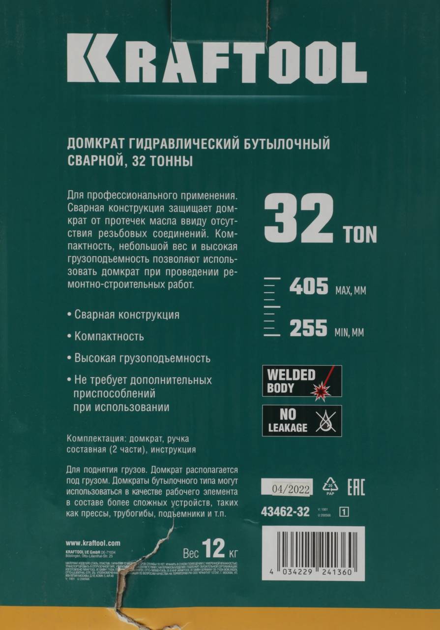 Домкрат KRAFTOOL Kraft-Lift 43462-32_z01 бутылочный гидравлический зеленый/серый (43462-32_Z01)
