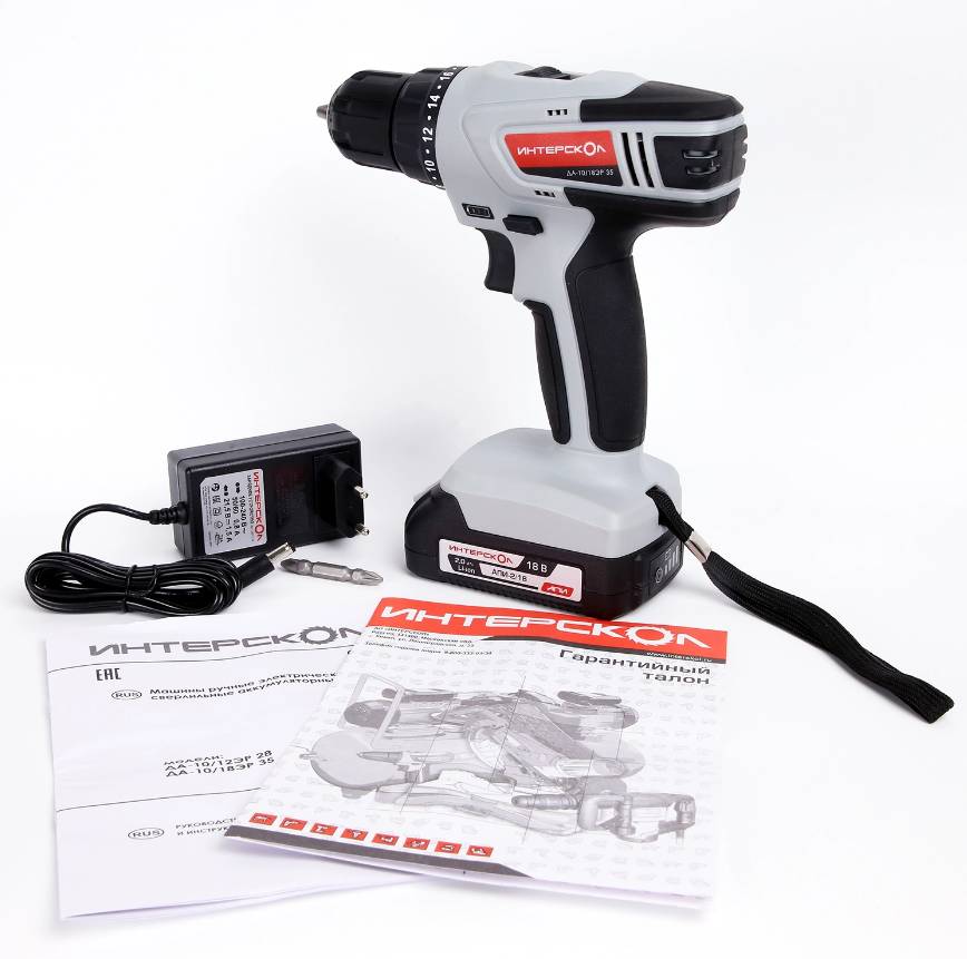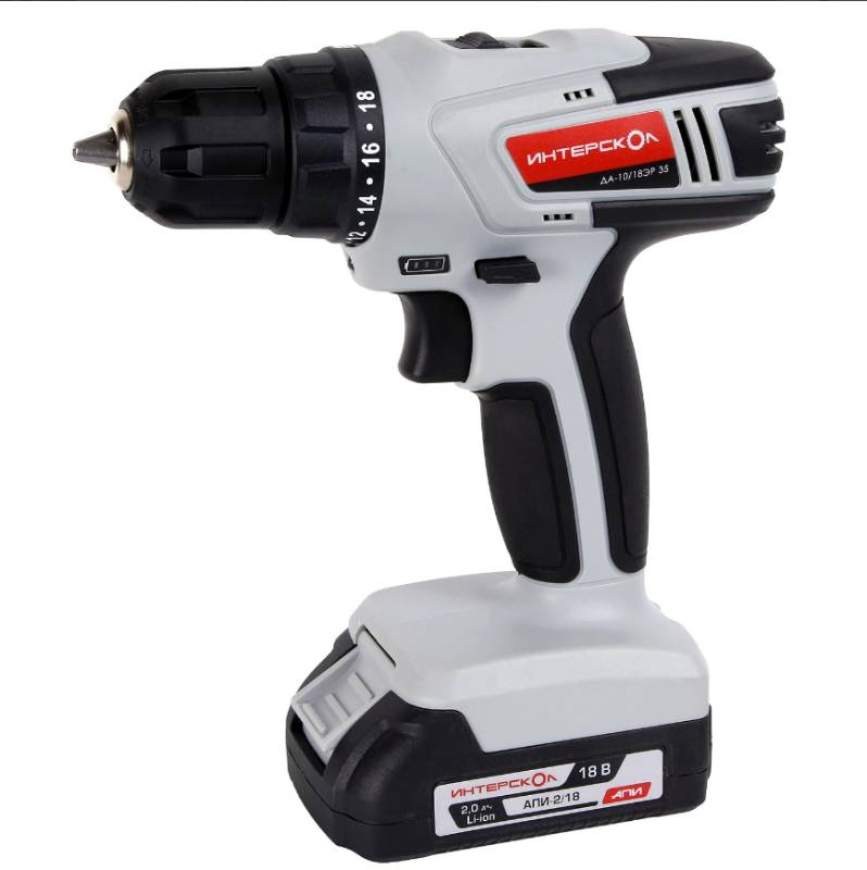 Дрель Аккумуляторная дрель-шуруповерт ИНТЕРСКОЛ ДА-18ЭР 35 ПРОМО, 18В, 1400 об/мин, с 1 АКБ 2 Ач и ЗУ (518.2.1.20)