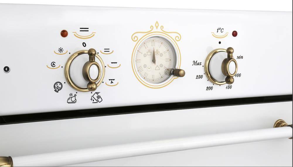 Встраиваемый электрический духовой шкаф. Цвет Белый с рисунком "Ретро", цвет ручек Бронза. Габариты (ШхГхВ) 59.8х56.5х59.5 см. Объем духовки 55л, Сенсорный таймер, гриль электрический, подсветка духовки двойная, Усиленный гриль с конвекцией, съемные проволочные направляющие духовки.