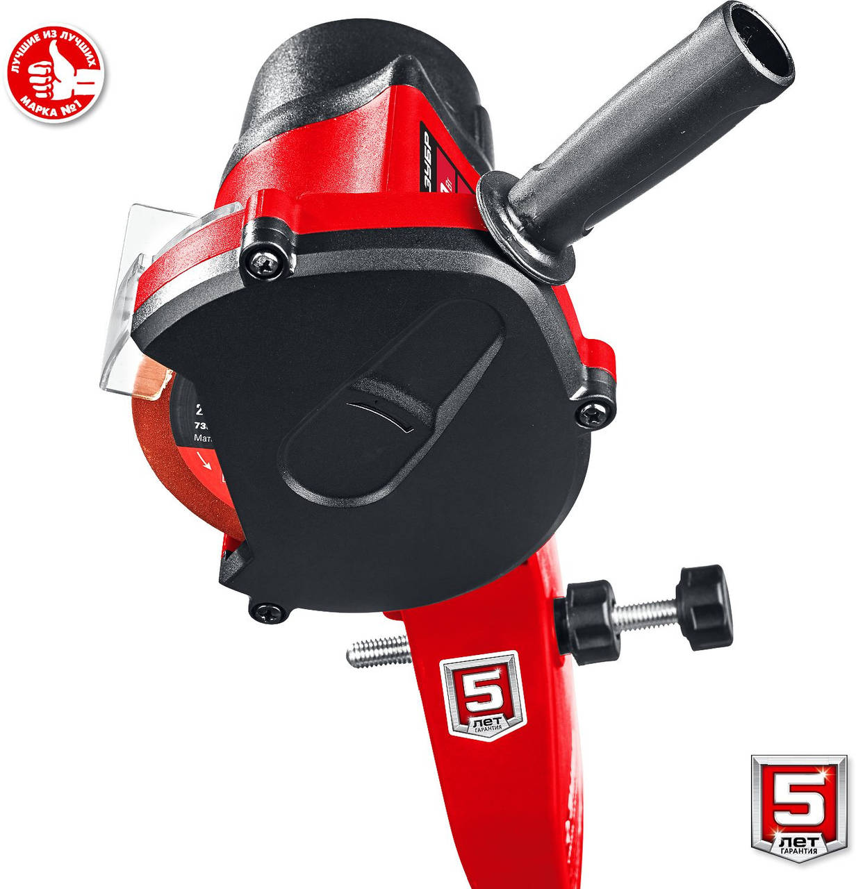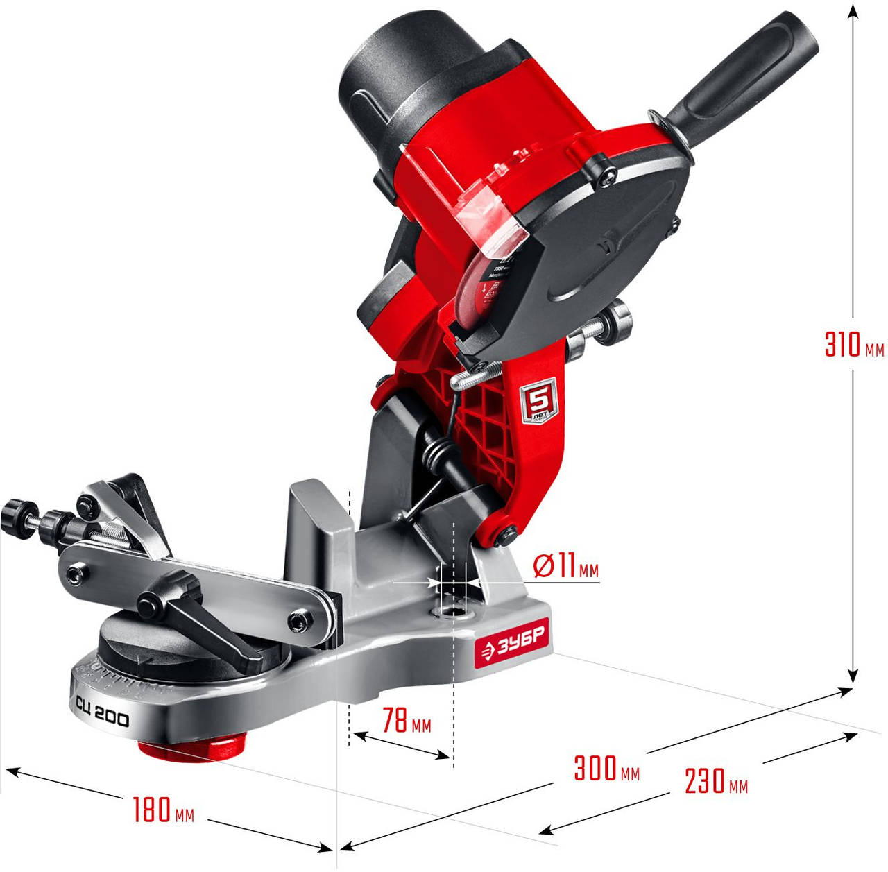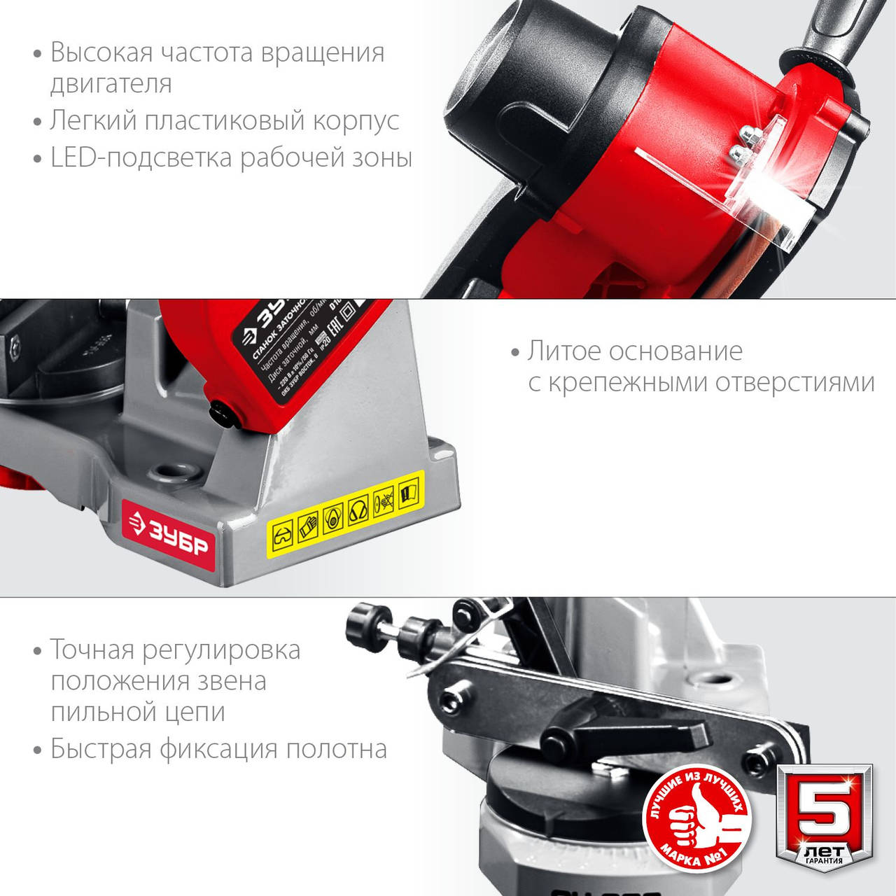 2 диска разной толщины для различных типов пильных цепей. Компактный и мощный коллекторный двигатель. LED подсветка. Прозрачные экраны для защиты оператора от продуктов обработки. Быстрозажимная система фиксации цепи. Регулировка глубины точения. Возможность крепления к опорной поверхности.