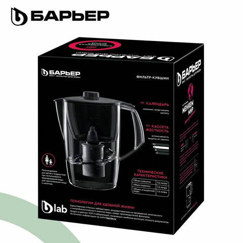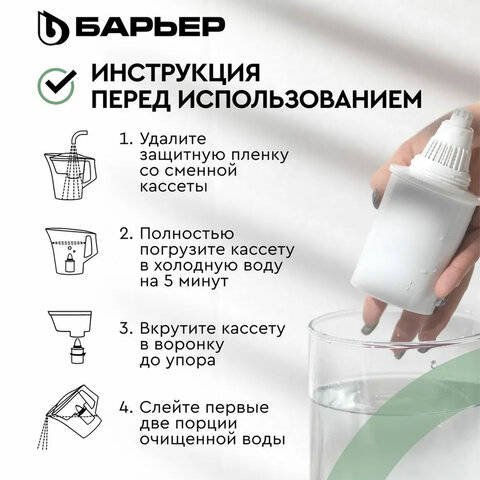 В комплекте с кувшином предусмотрена кассета БАРЬЕР "Жесткость", которая подходит для жесткой воды и уменьшает накипь за счет удаления солей жесткости, выпадающих в осадок. Кассета умягчает воду, защищает от хлора, тяжелых металлов и других вредных примесей. Ресурс кассеты рассчитан на 350 литров.