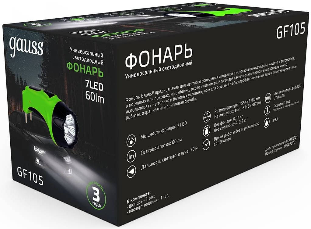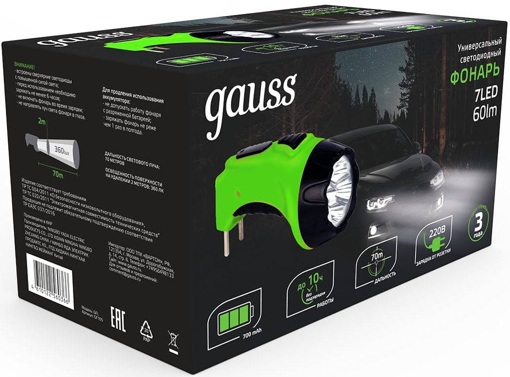 Фонарь GAUSS ручной GFL105 черный 7Вт лам.:светодиод.