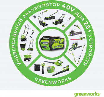 | Особенности: | Триммер аккумуляторный Greenworks 40 вольт (модель GD40BC) - отличная замена электро или бензиновому триммеру, он с легкостью справиться с высокой травой, а благодаря пильному диску (в комплекте) можно резать крупный кустарник. |