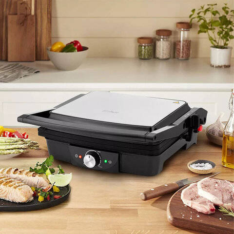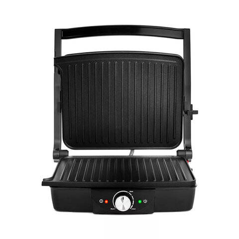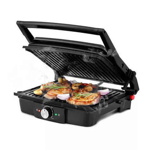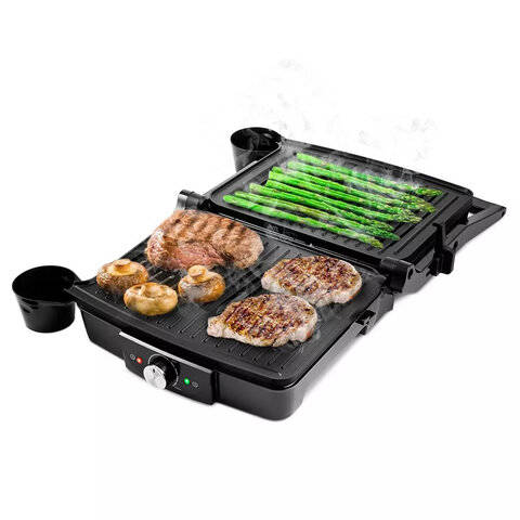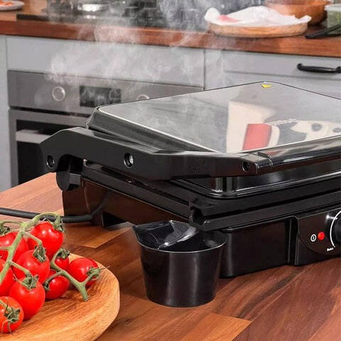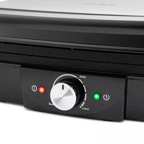 Управление простое и интуитивное: плавная регулировка температуры от 100–140C до 180–220C позволяет точно подобрать режим для каждого типа продуктов. Световые индикаторы показывают включение питания и активацию нагревательного элемента. Режим барбекю 180 позволяет откинуть крышку на всю ширину — гриль превращается в открытую жаровню, где можно одновременно готовить на двух поверхностях. Для этого предусмотрена специальная кнопка на корпусе.