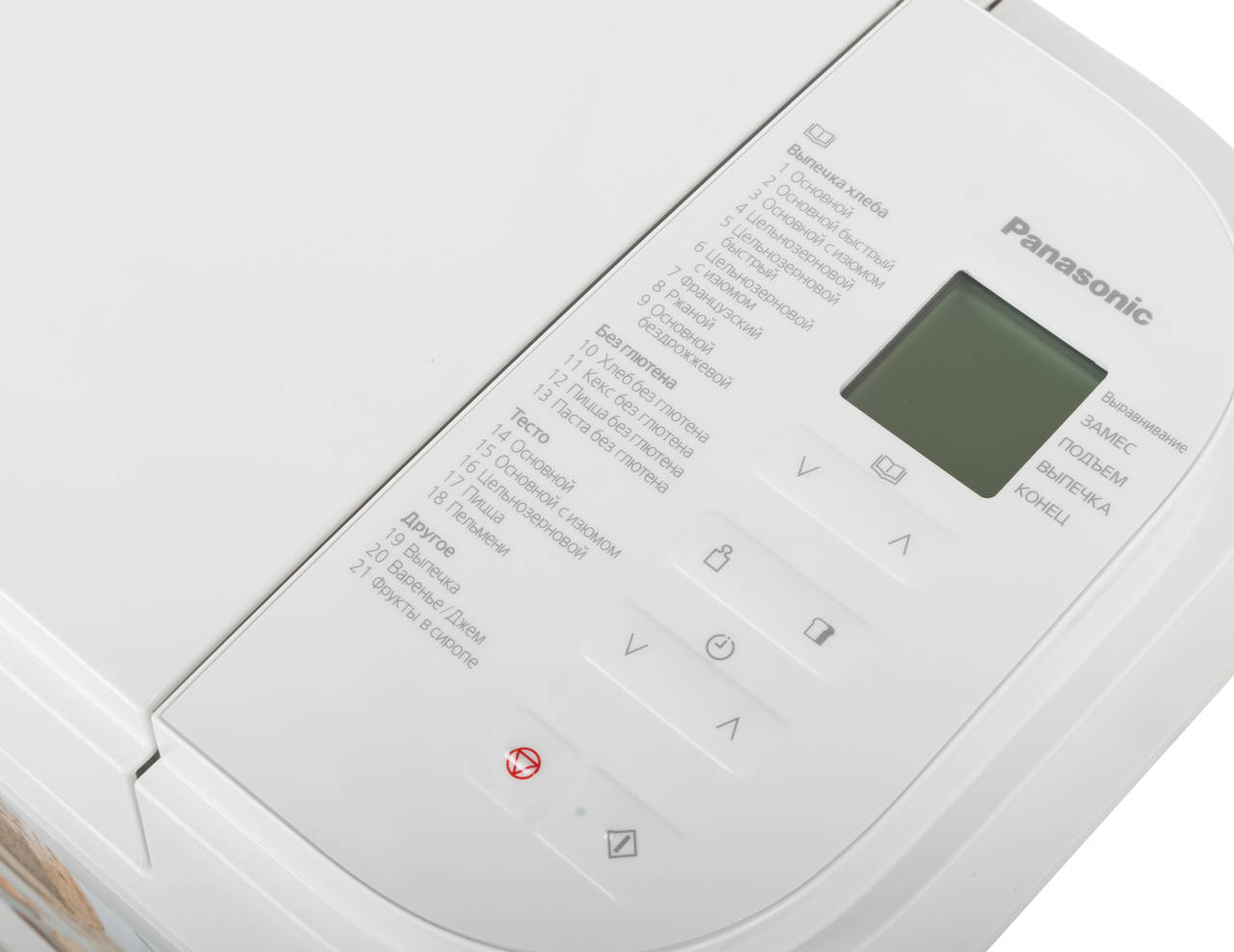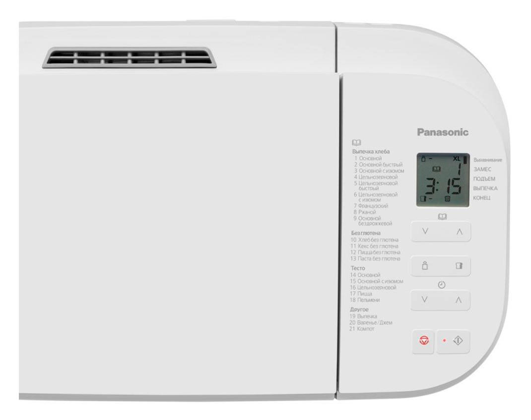 | Программы выпечки: | Основной. Основной быстрый. Основной с изюмом. Цельнозерновой. Цельнозерновой быстрый. Цельнозерновой с изюмом. Французский. Ржаной. Основной бездрожжевой. Хлеб без глютена. Кекс без глютена. Пицца без глютена. Паста без глютена. Выпечка. Варенье/Джем. Фрукты в сиропе. |