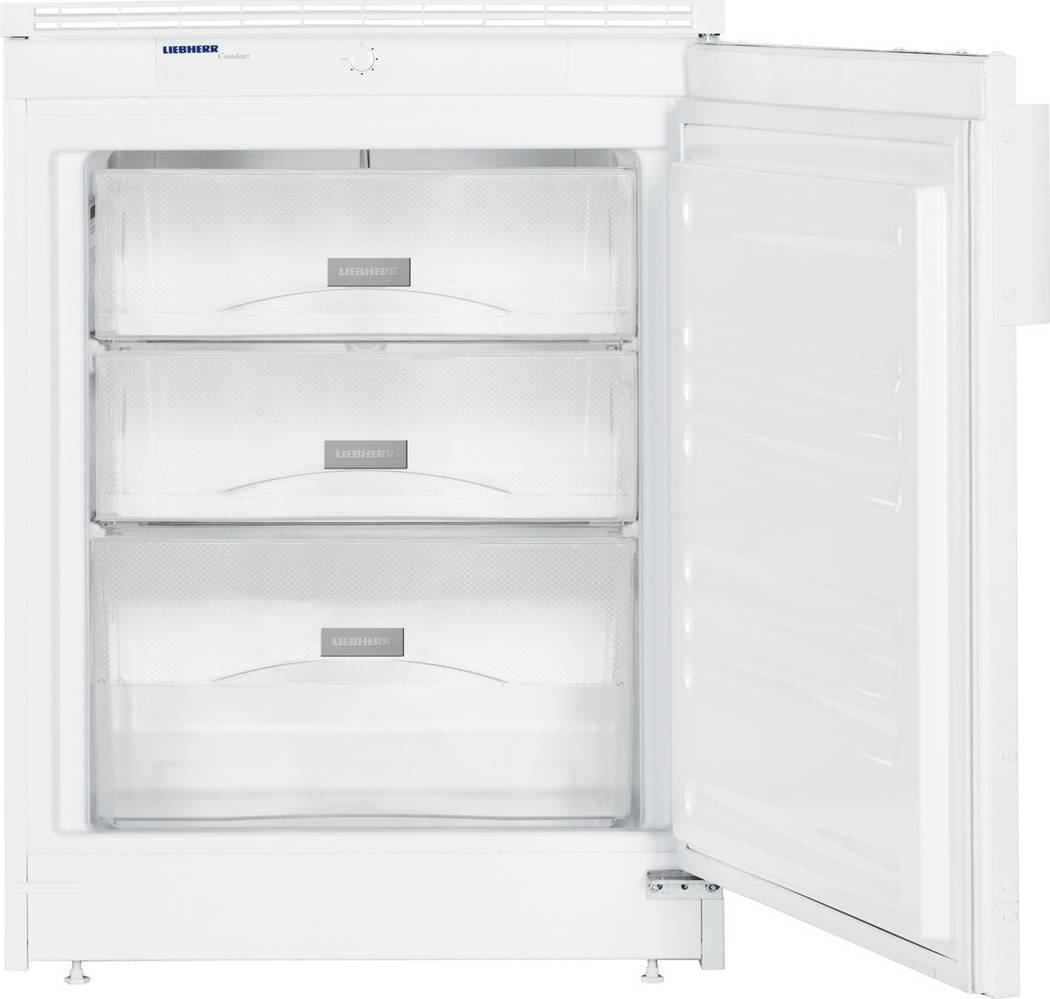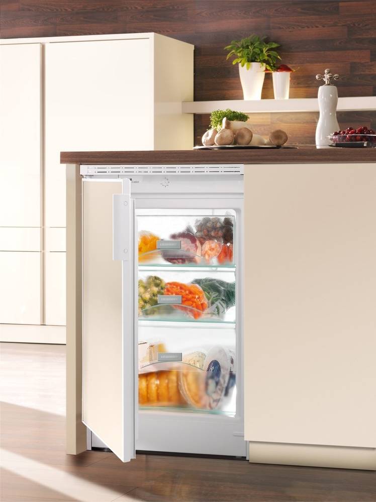 Встраиваемая под столешницу морозильная камера LIEBHERR UG 1211 класса Comfort используется для замораживания и хранения пищевых продуктов. Полки изготовлены из стекла. Предназначена для использования в домашних условиях, а также в офисах и отелях. Ключевые особенности: Механическое управление - поворотный регулятор Один регулируемый температурный контур Особенности конструкции: Правосторонняя дверца с возможностью перенавешивания Вентиляция цоколя Декоративная рама Две регулируемые по высоте ножки Евро штекер Камера: Ручное размораживание Система FrostSafe - 3 полностью прозрачных выдвижных контейнера Система SmartFrost - замораживание без образования инея на продуктах и внутренних стенках камеры Система VarioSpace - создание дополнительного пространства для хранения объёмных продуктов Символьное обозначение - 4 звезды (замораживание и длительное хранение продуктов при температуре -18 °C и ниже с сохранением витаминов и минералов)