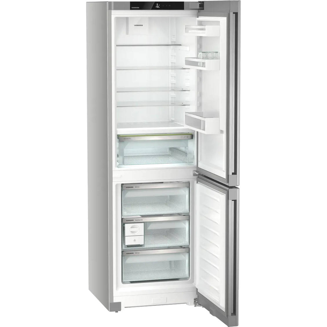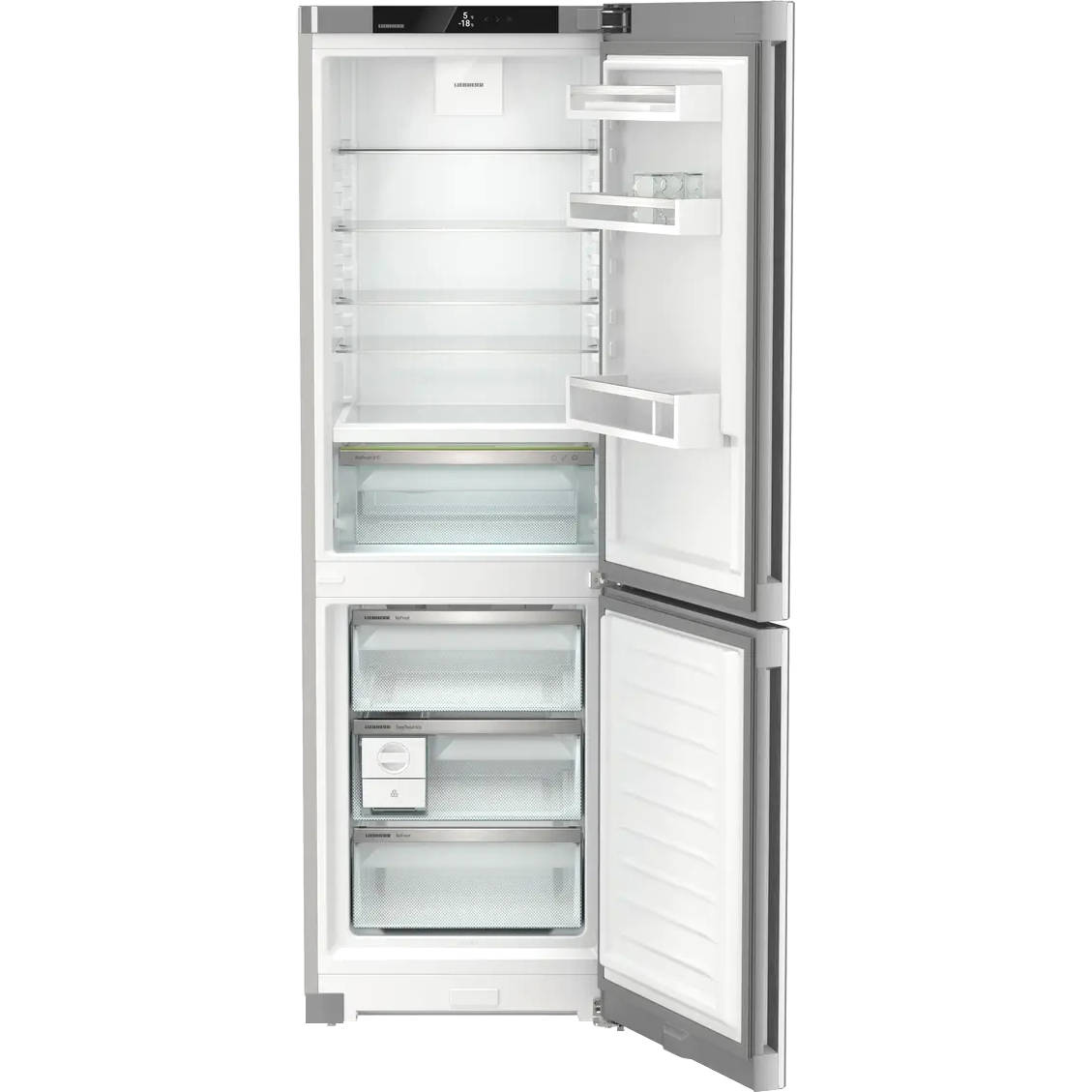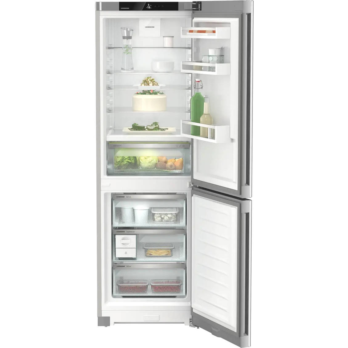 Верхний отсек оборудован пятью полками, выполненными из закаленного стекла, четыре из них можно переставлять по высоте. На двери — три кармана, нижний предназначен для бутылок. Также предусмотрена зона BioFresh — контейнер, в котором фрукты и овощи будут храниться при оптимальной влажности и дольше сохранят свою свежесть.
