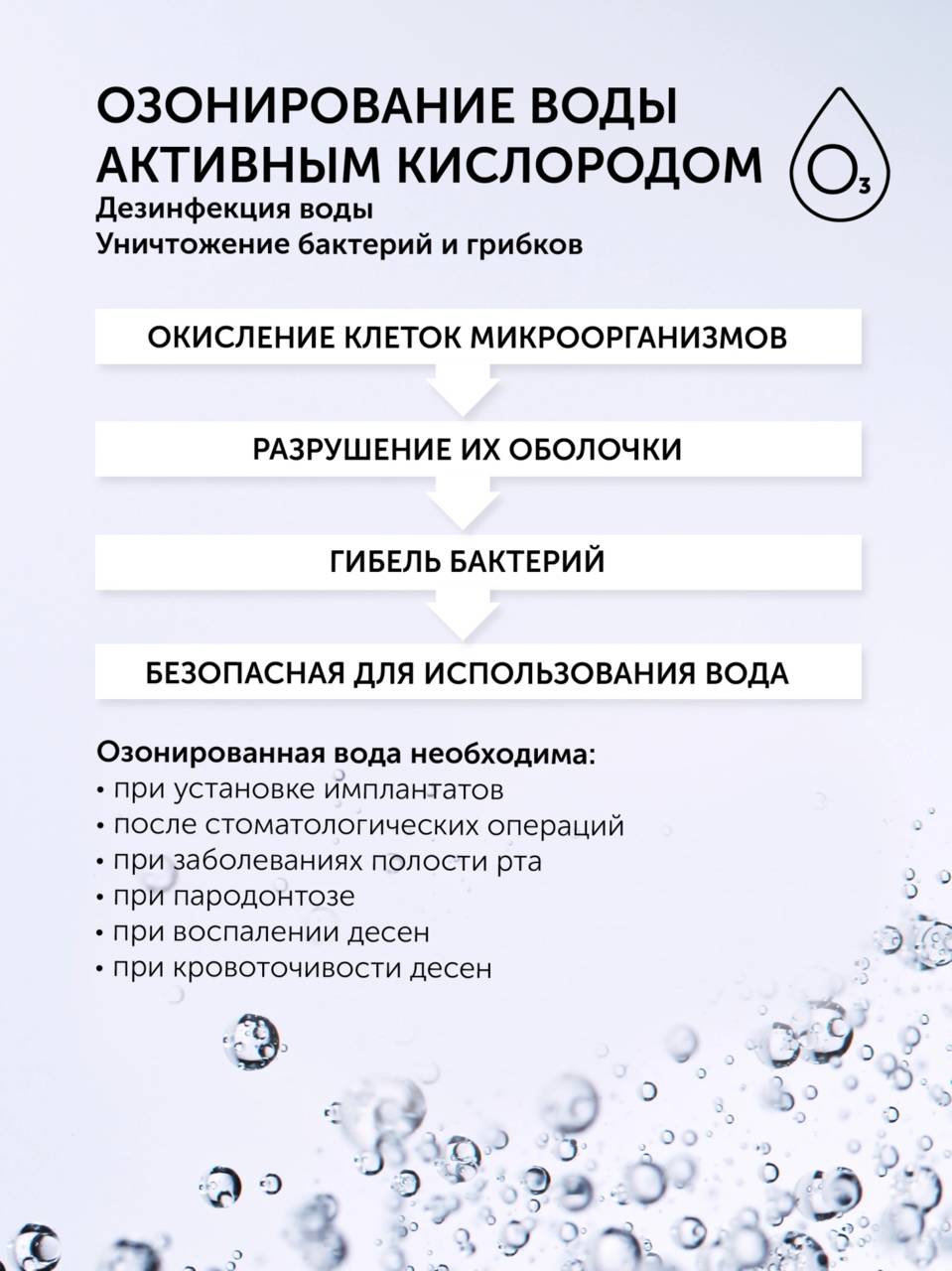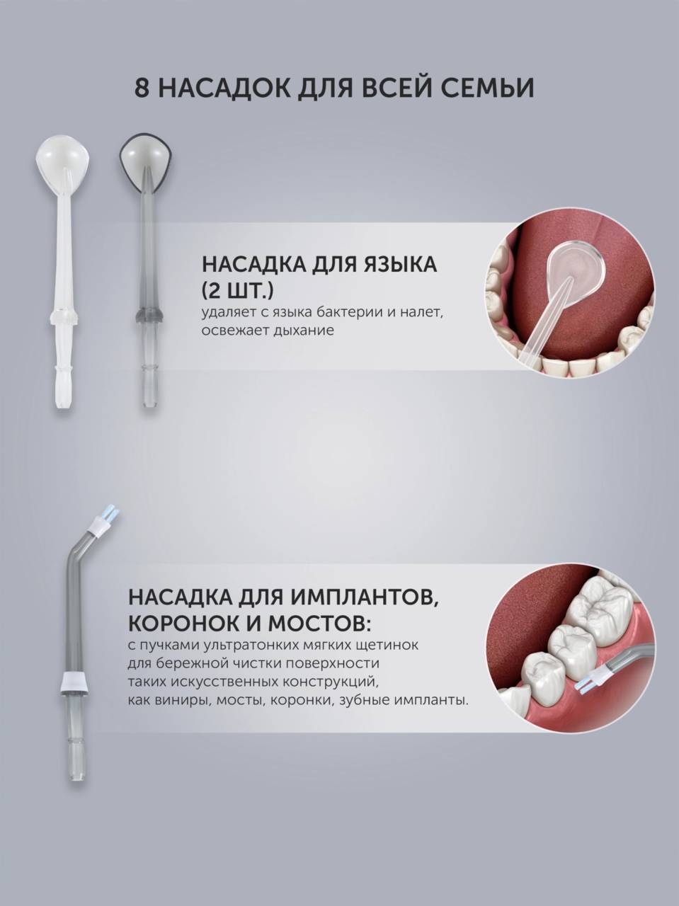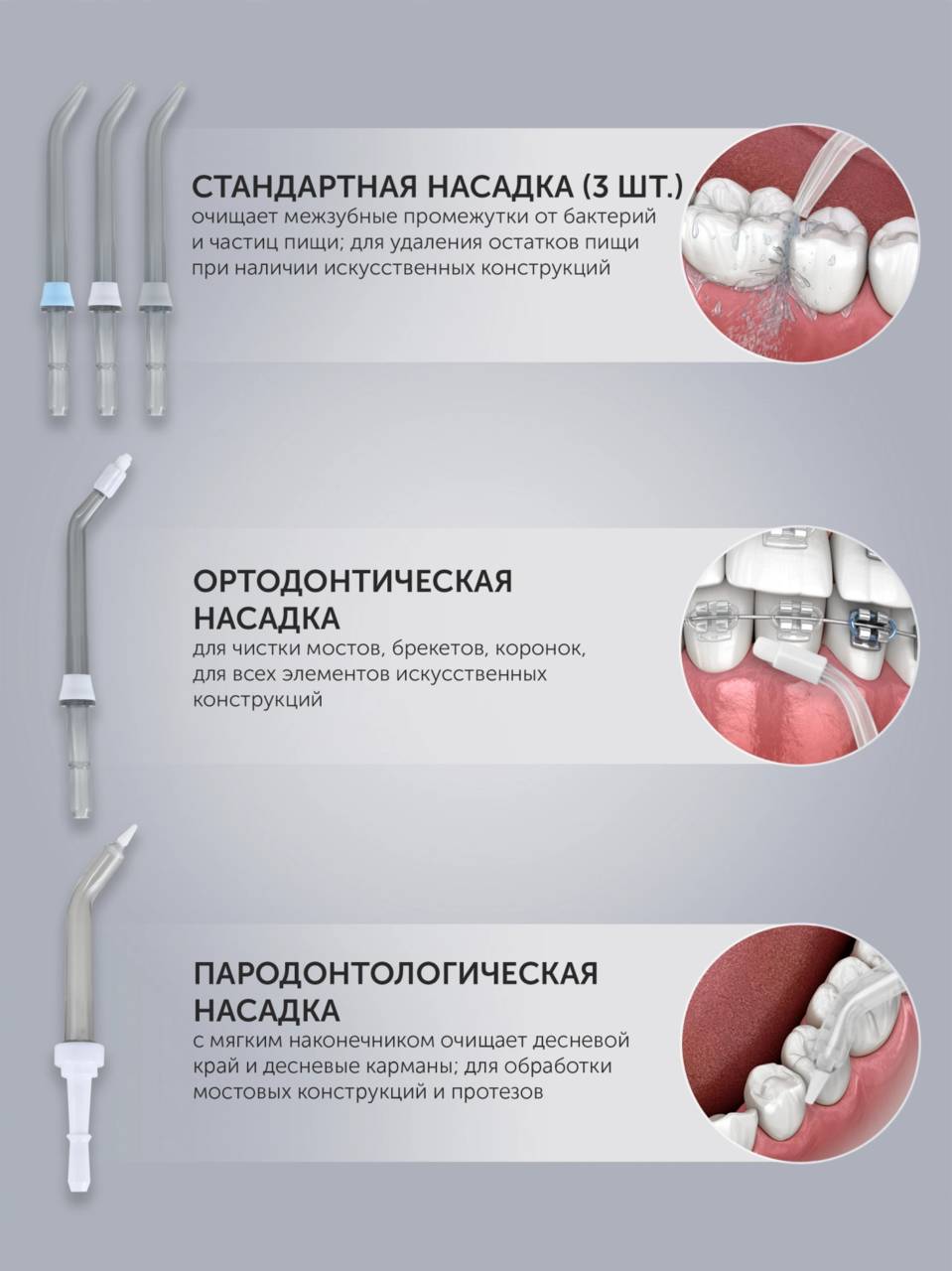 Особенности:чистка межзубных промежутков, удаление налета напором воды в дополнение к зубной щетке; соблюдение гигиены при наличии имплантов, брекетов, коронок, мостов; для оздоровления десен с помощью массажа; озонирование воды: дополнительная дезинфекция воды; способствует снятию воспаления с десен