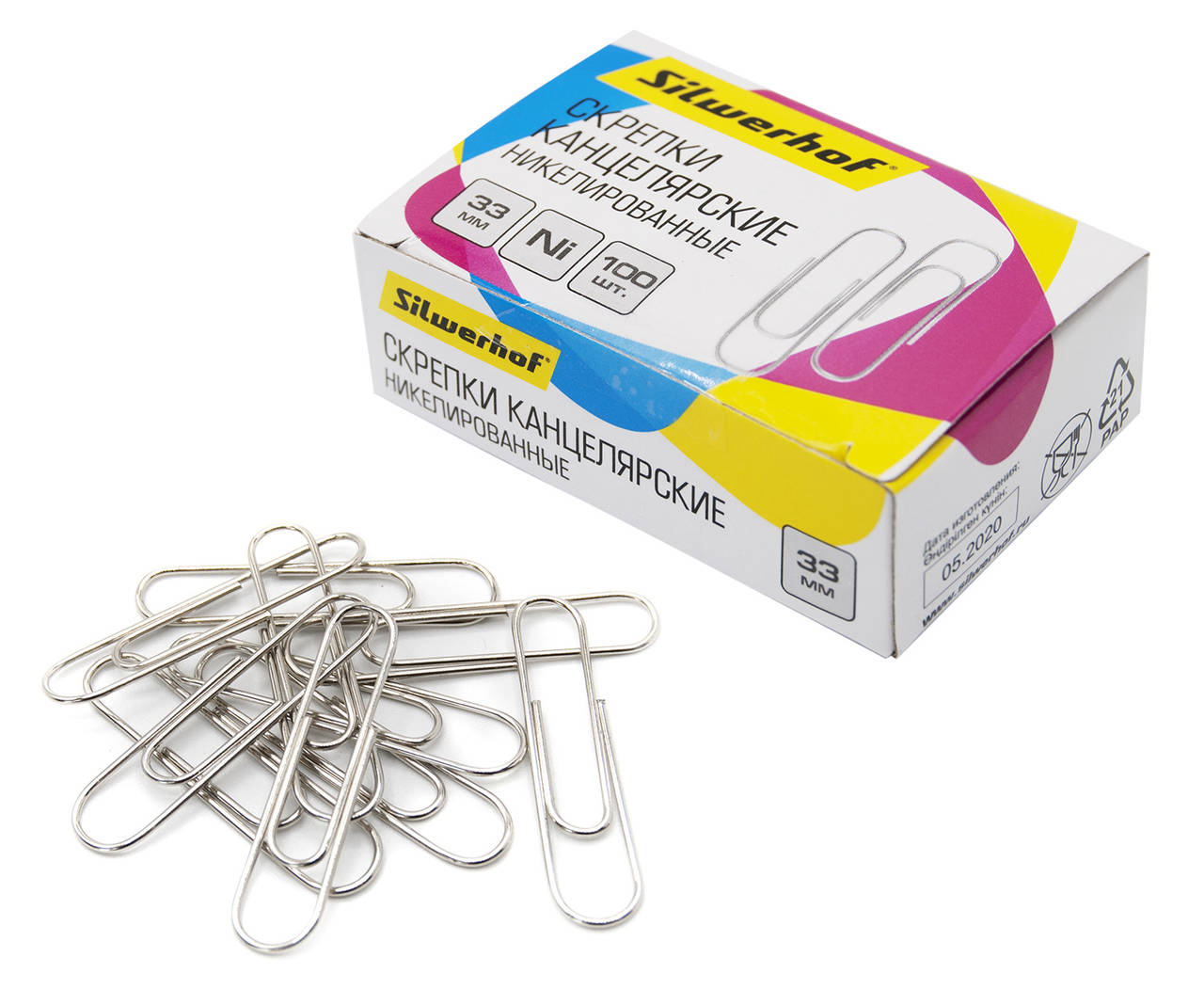 Канцтовар SILWERHOF Скрепки никель 33мм  картонная коробка1504305-11504305-21504305-3