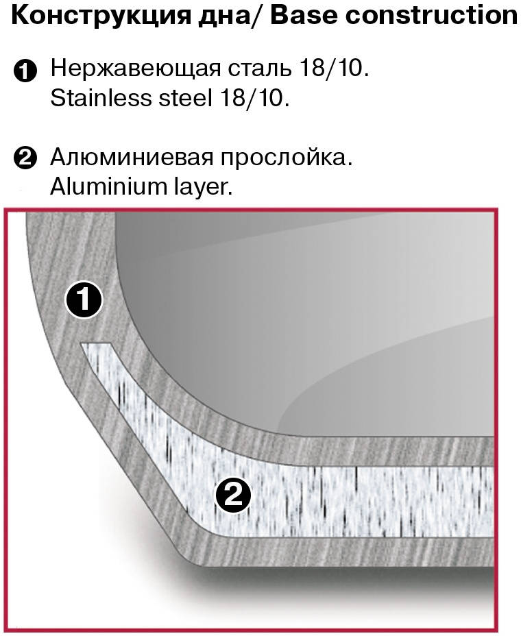 | Особенности: | Технология: тройное вштампованное, а затем вплавленное дно без воздушных полостей. Преимущества: эргономичная форма ручек; Внутренние отметки литража. Подходит для посудомоечной машины при условии использования неагрессивных моющих средств с нейтральным уровнем pH |
