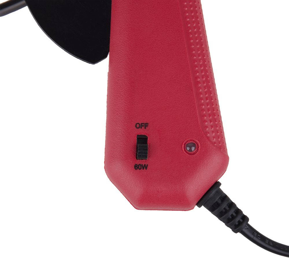 Профессиональный клеевой пистолет выполнен из ударопрочного пластика. Кнопка на корпусе позволяет выключать прибор, оставляя шнур в розетке. Есть индикатор нагрева, защита от протекания клея, скоба для установки в нерабочем положении. Эргономичная ручка удобно лежит в руке. Кабель 1,35 м.