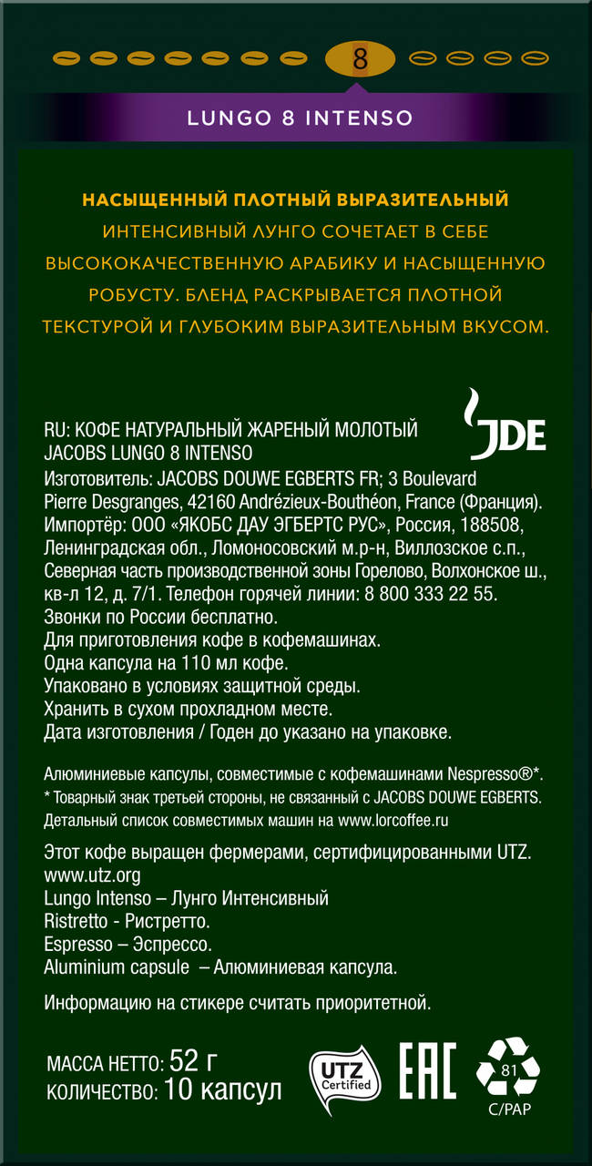 Кофе JACOBS MONARCH капсульный Lungo 8 Intenso Nespresso Nespresso