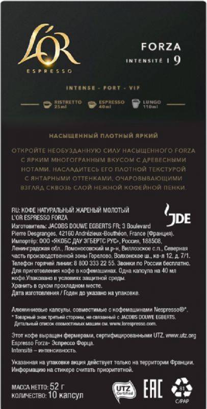 Кофе L`OR капсульный Espresso Forza упаковка:10капс. 52г. Nespresso