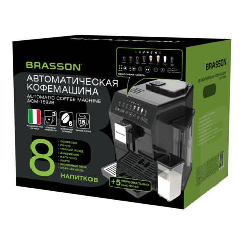 Кофемашина BRASSON автоматическая ACM-1592B, дисплей, капучинатор, 13 напитков, 1450 Вт, 20 бар, 457887