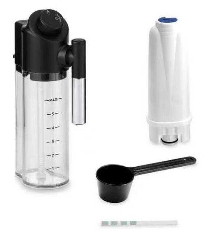 Комплектация: тест полоска; емкость для молока с капучинатором; инструкция; Декальцинатор; мерная ложка; фильтр для воды; кофемашина