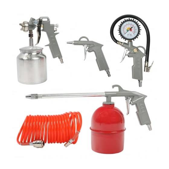 | Комплектация: | Спиральный шланг; Краскораспылитель; Пистолет для продувки; Пистолет для накачки шин; Пульверизатор; |