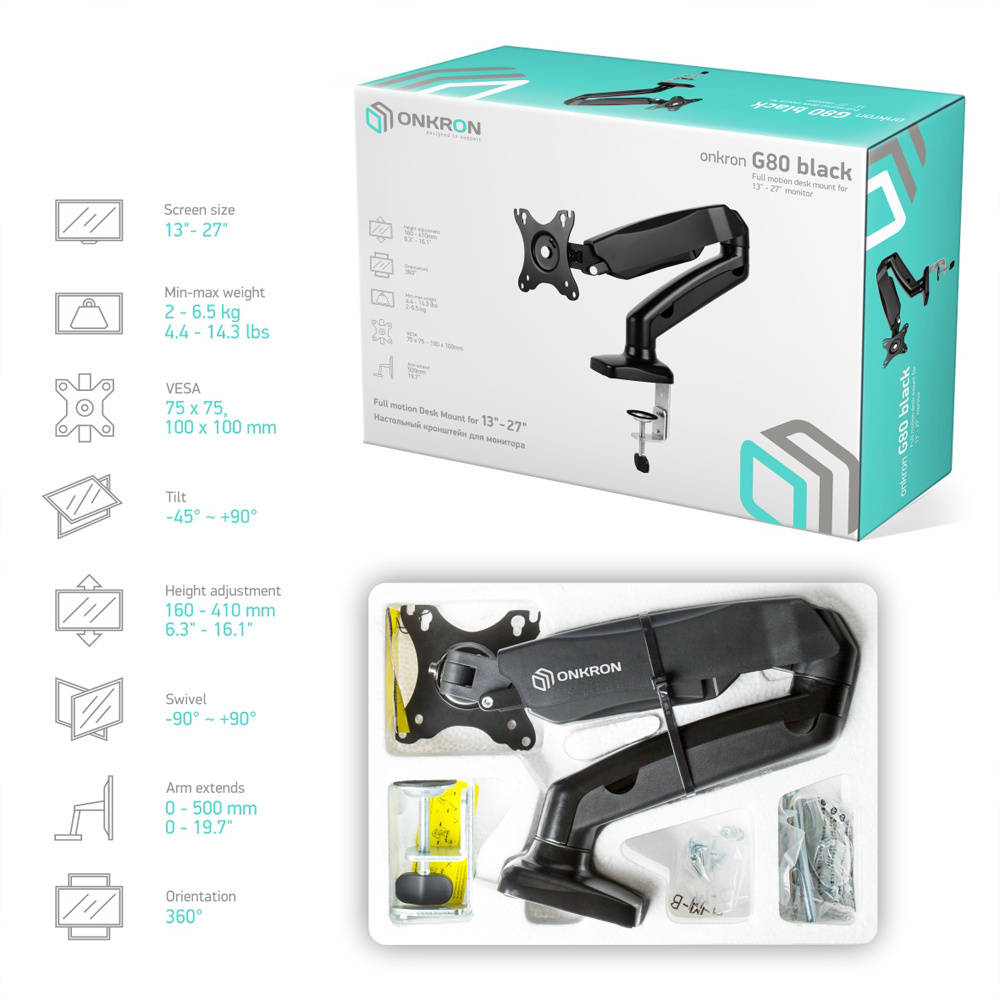 ONKRON G80 - это стильный настольный кронштейн для одного монитора. Он подходит для большинства компьютерных мониторов весом до 8 кг с диагональю от 13 до 32 дюймов.