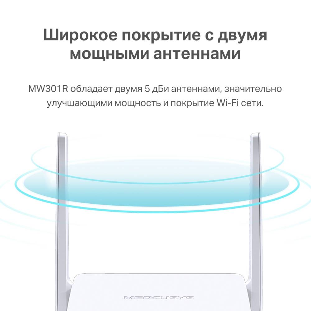 Маршрутизатор Mercusys Technologies CO N300 Wi-Fi роутер, 1 порт WAN 10/100 Мбит/с + 2 порта LAN 10/100 Мбит/с, 2 фиксированные антенны (MW301R)