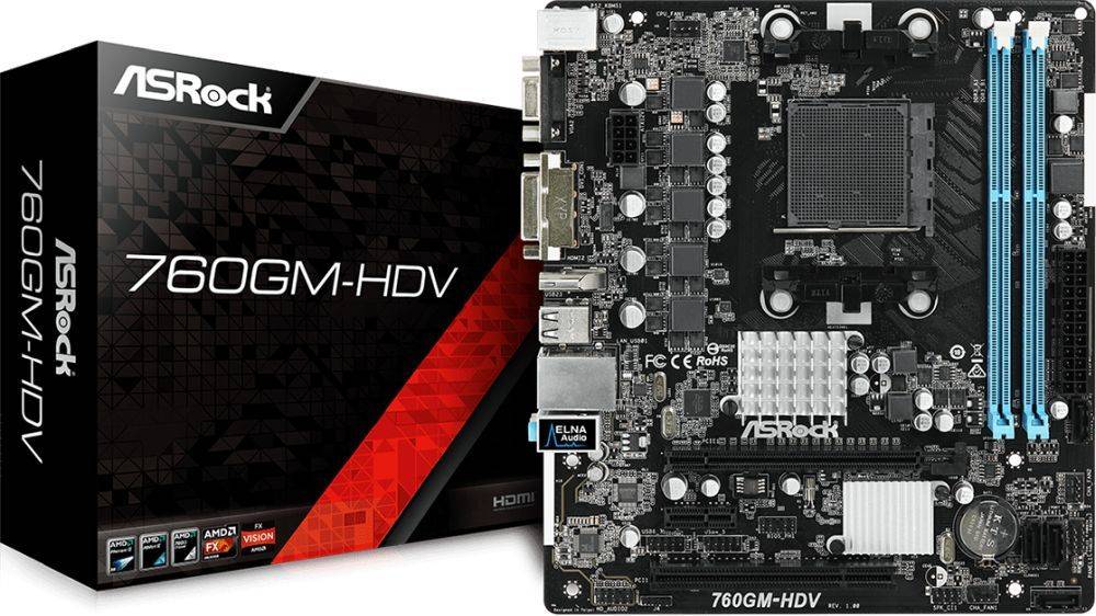 Материнская плата ASRock Материнская плата Asrock 760GM-HDV Soc-AM3+ AMD 760G 2xDDR3 mATX AC`97 6ch(5.1) GbLAN RAID+VGA+DVI+HDMI (760GM-HDV)