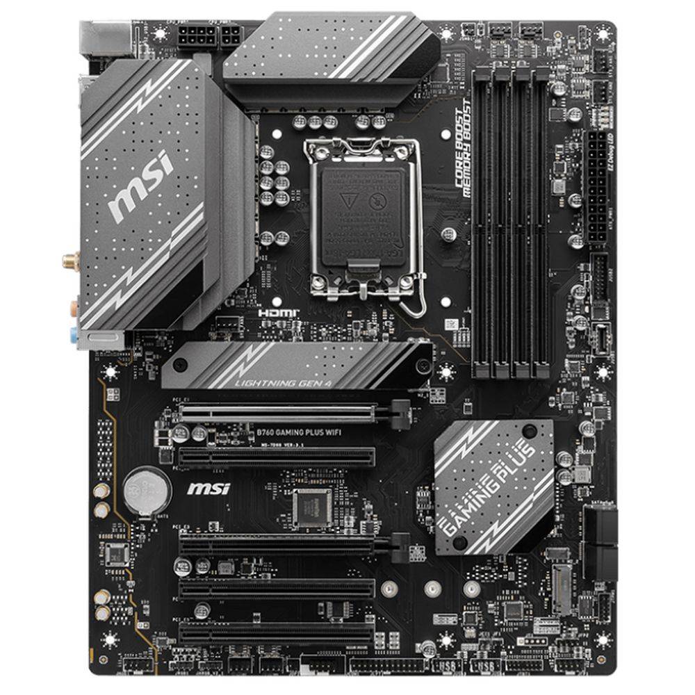 Материнская плата MSI B760 GAMING PLUS WIFI B760, LGA1700, 4*DDR5, 5*PCIEx16, 2*M.2, 2*TypeC, 2*USB3.2Gen2, 2*USB3.2Gen1, 8*USB2.0, 4*SATA3.0, 2.5G, DP, HDMI, ATX, RTL
