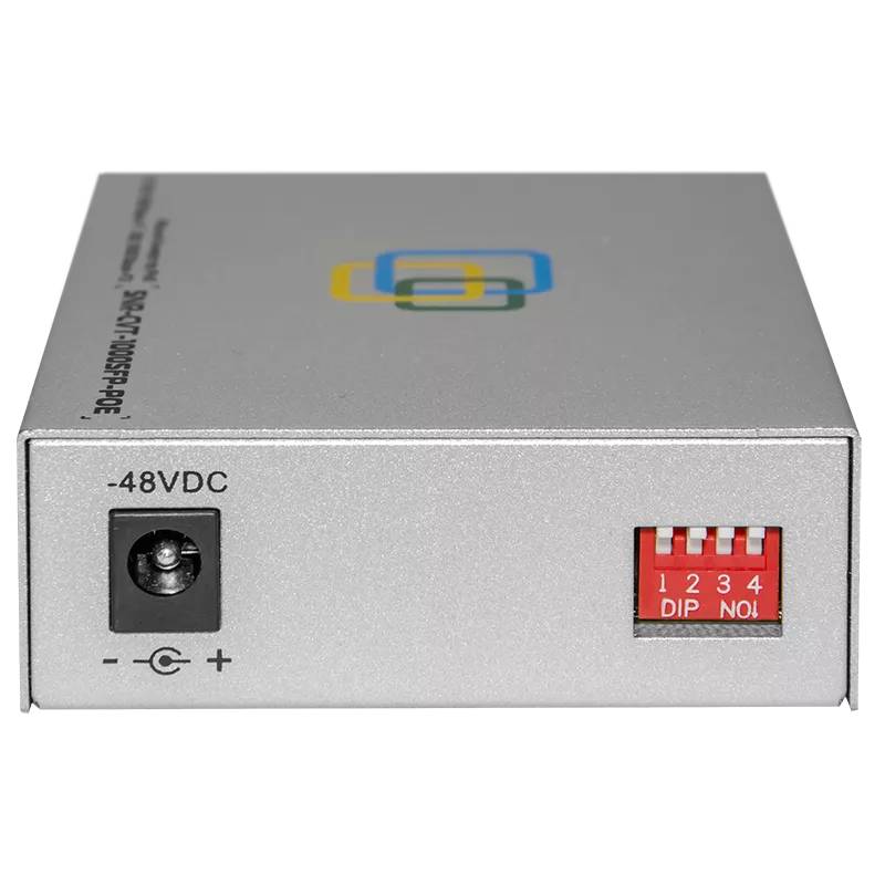 Медиаконвертер SNR-CVT-1000SFP-POE предназначен для преобразования сигнала из стандарта 10/100/1000Base-T в сигнал 100/1000Base-FX. Скорость переключения выбирается DIP-переключателем. Медиаконвертер оснащен слотом SFP для оптических трансиверов, которые пользователь может выбрать самостоятельно. Это позволяет расширить сетевое соединение на различные расстояния в зависимости от возможностей SFP-трансивера.