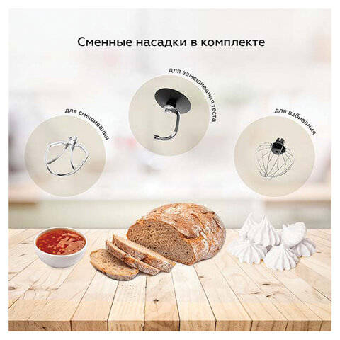 Кроме того, в комплект входят три насадки - для замешивания теста, взбивания и смешивания, которые позволят вам экспериментировать с текстурами и способами приготовления. Крышка от разбрызгивания предотвратит загрязнение кухонной поверхности во время работы устройства. Планетарное смешивание обеспечивает равномерное и качественное смешивание ингредиентов.