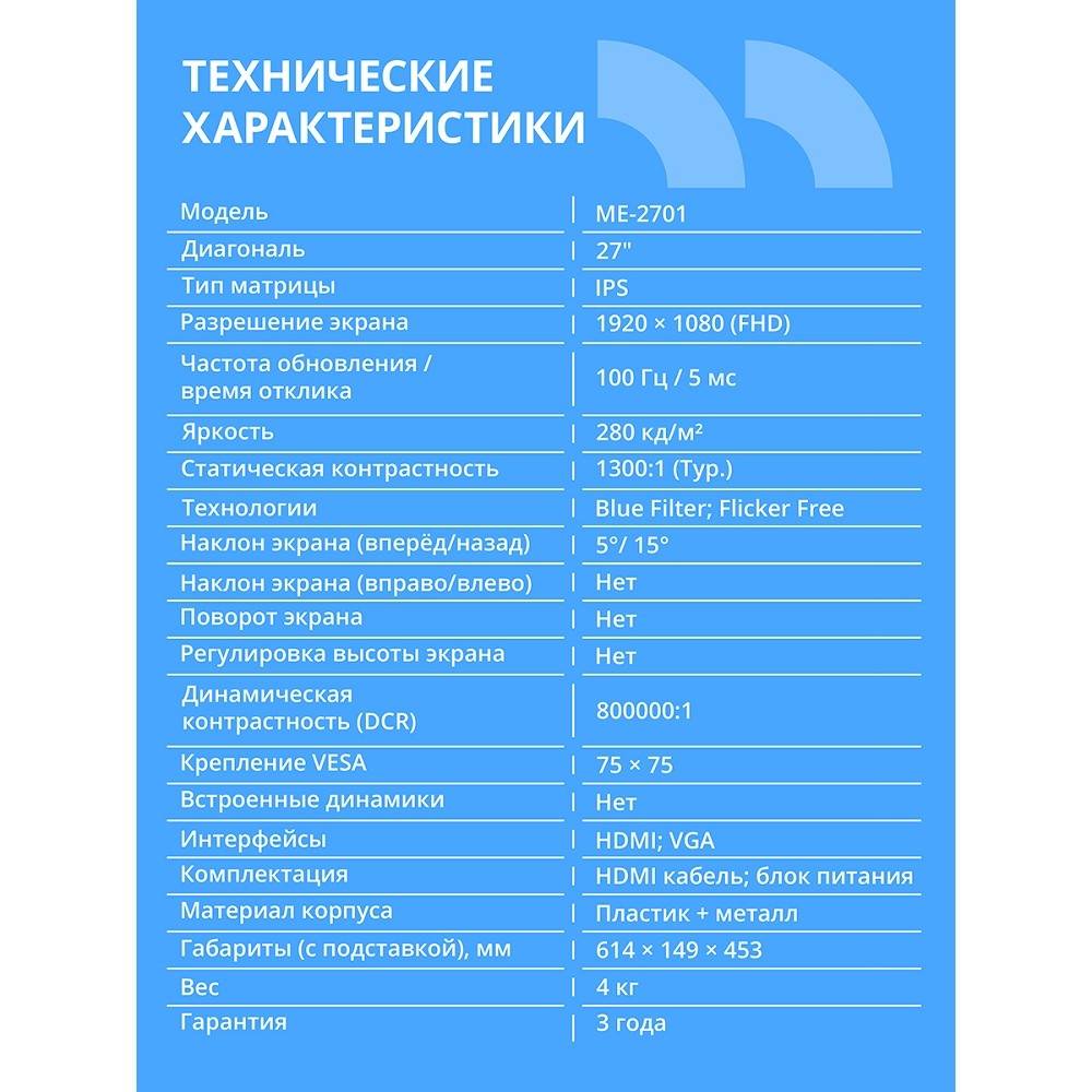 Монитор LCD 27" ME-2701, IPS, FHD 1920x1080, 100Гц, 1*HDMI/1*VGA, внешний БП, черный, кабель 1*HDMI 1.5м [LCD-ME2701-OPC] (LCD-ME2701-OPC)