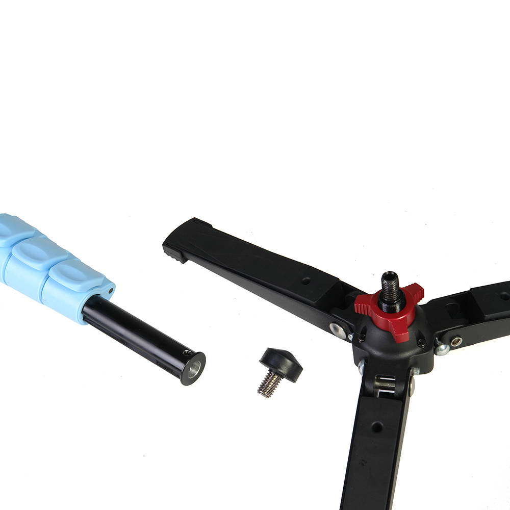К нижнему основанию монопода крепится опора из трех складывающихся стальных лапок с резиновыми вставками. Благодаря этой опоре монопод надежно устанавливается на любой поверхности. Опора на шаровом основании позволяет наклонять монопод под углом до 15, а специальная гайка поможет ограничить угол наклона до нужной величины.