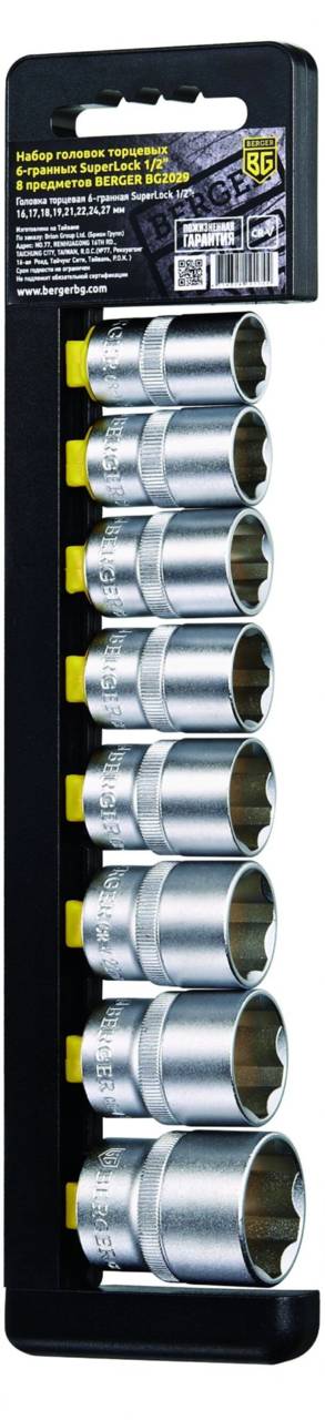 | Другие инструменты/принадлежности: | Набор головок торцевых 6-гранных SuperLock 1/2" 8 предметов BERGER. 8шт.- головка торцевая 6-гранная Super lock 1/2": 16, 17, 18, 19, 21, 22, 24, 27 мм. |