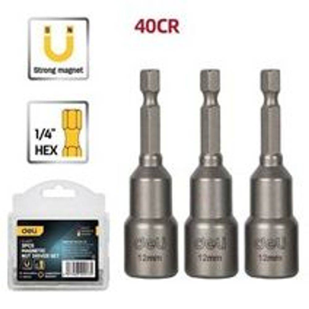 Набор оснастки DELI Набор магнитных бит с торцевой головкой 3шт DL4812T 12мм, длина 65мм, сталь 40Cr, пласт. кейс