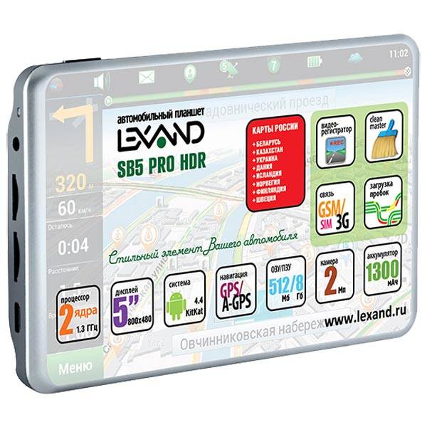 Lexand SB-5 PRO HDR - компактное устройство, обладающее возможностями GPS-навигатора и видеорегистратора. Устройство оснащено 5-дюймовым экраном с разрешением 800х480 пикселей. Он подходит как для отображения навигационных карт, так и для воспроизведения видео. Установлен Навител Навигатор 9.6, включающий в себя карты России, Европы, а также карты крупных российских городов. Благодаря этому владелец может легко прокладывать маршруты и объезжать пробки. Разработчики предусмотрели камеру с углом обзора 130 градусов, способную снимать видео с разрешением HD. На снятом видеоролике несложно будет разобрать номер автомобиля, рассмотреть дорожные знаки или лица людей. При установке в автомобиле устройство работает от прикуривателя, но оно оснащено встроенным аккумулятором и может использоваться автономно.