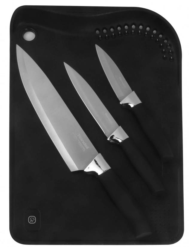 | Состав комплекта: | Нож для чистки овощей, поварской, универсальный, разделочная доска |