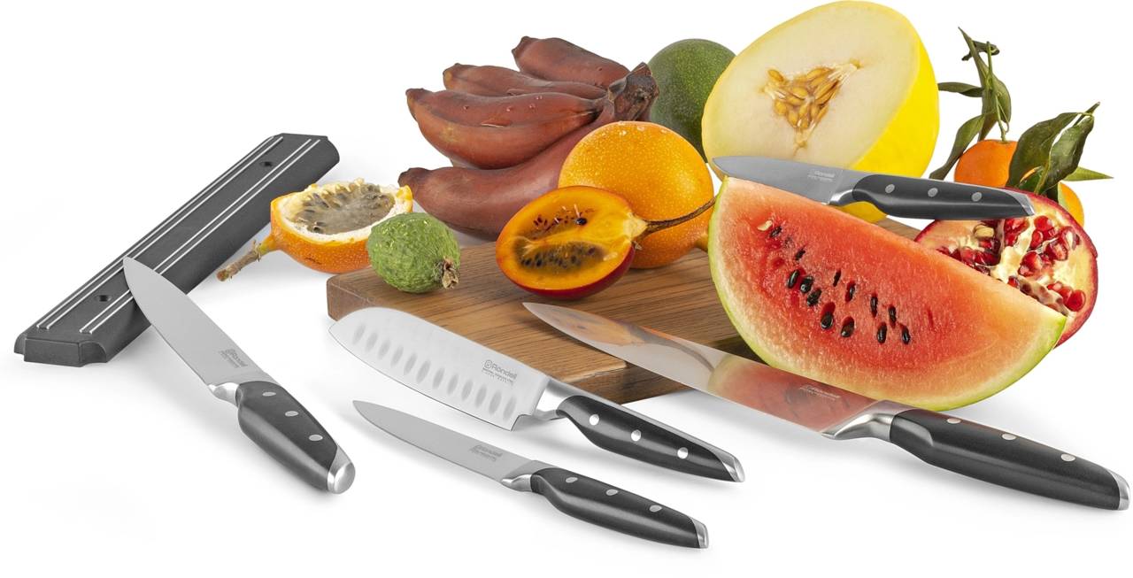 | Состав комплекта: | Нож поварской - 20 см, нож разделочный - 20 см, нож универсальный - 12,7, нож сантоку - 12,7 см и нож для чиски овощей - 9 см, магнитный держатель |