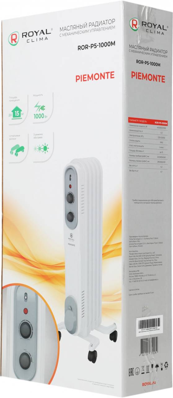 Обогреватель ROYAL CLIMA Радиатор масляный PIEMONTE ROR-P5-1000M 1000Вт белый/серый