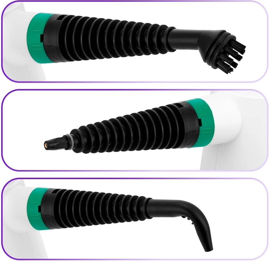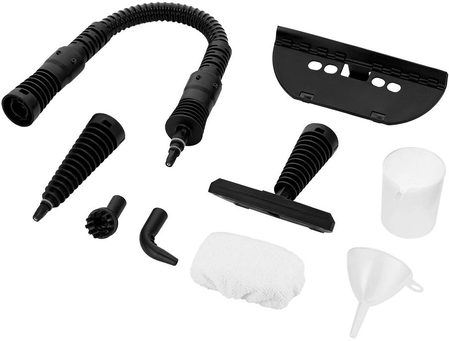 | Насадки в комплекте: | струйная насадка, насадка для отпаривания, тряпка для отпаривания, насадка с резиновым скребком, нейлоновая щётка, угловая насадка |