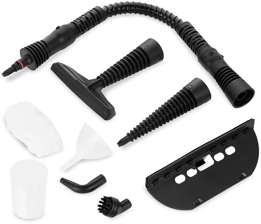 Насадки в комплекте:струйная насадка, угловая насадка, круглая нейлоновая щетка, паровой шланг, насадка для отпаривания, тряпка для отпаривания, насадка с резиновым скребком