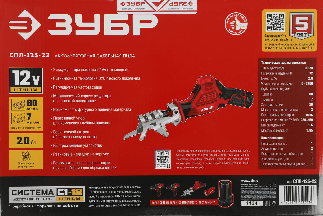 Пила сабельная ЗУБР Сабельная пила СПЛ-125-22 аккум. 2700ход/мин
