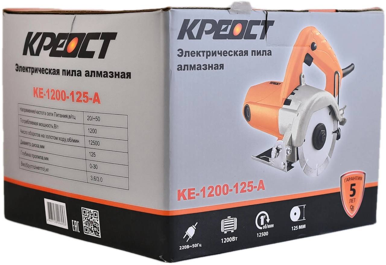 Особенности:Ручная электрическая алмазная пила КРЕОСТ KE-1200-125-A. Предназначена для мокрой резки крупноформатных плит, а также для резки камня. Позволяет развивать скорость диска до 12500 об/мин, благодаря чему обеспечивается эффективная работа по камню.