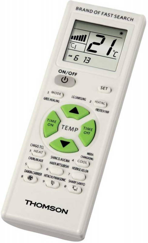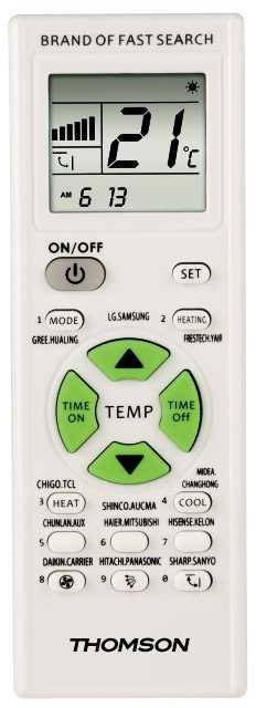 Для кондиционеров. Запрограммирован для всех распространенных марок устройств. 3 варианта установки кода: прямой ввод, поиск бренда, универсальный поиск, защита от детей. ЖК-дисплей для управления режимом работы, температурой, силой вентилятора, направлением воздушного потока, таймером.