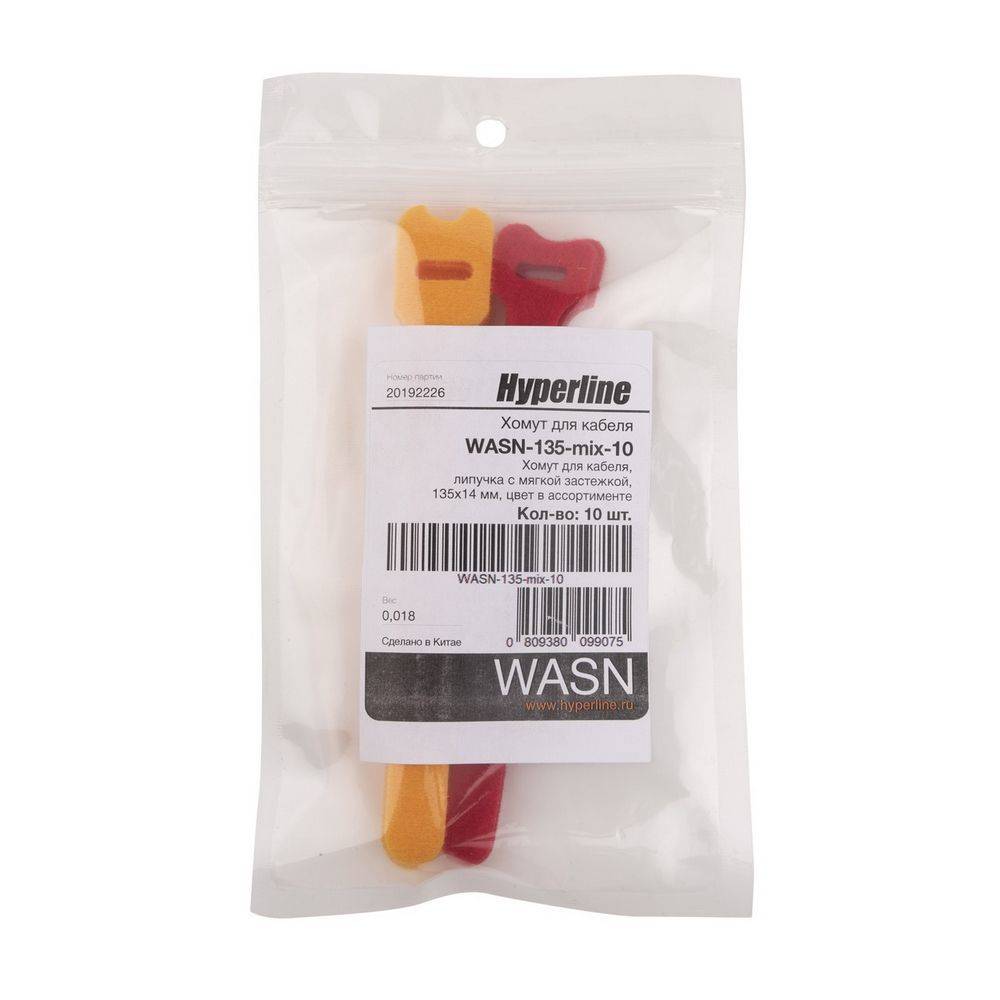 Серверный шкаф HYPERLINE Крепеж WASN-135-mix-10 Хомут для кабеля, липучка с мягкой застежкой, 135x14мм, цвет в ассортименте