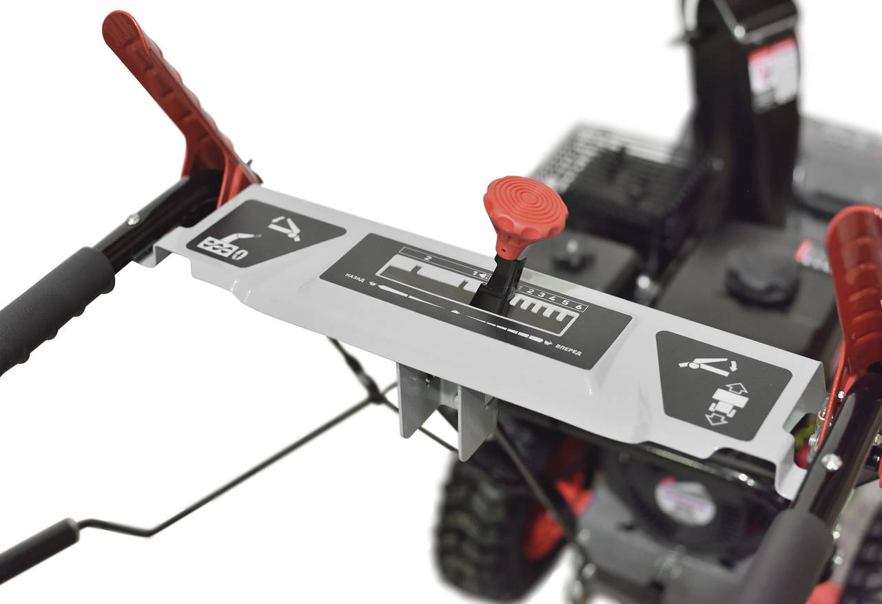 Самоходный снегоуборщик. Собранный снег выбрасывается на расстояние до 15 метров. Этот параметр регулируется, в том числе есть возможность выбрать сторону для сброса снежной массы. Используемая система шнеков – двухступенчатая. Ширина ковша составляет 560 мм.