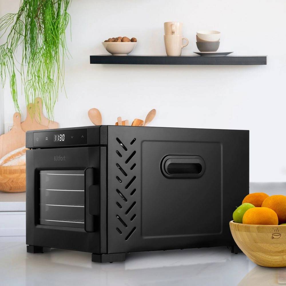 Вместительная сушилка Kitfort КТ-1964 сохранит любимые фрукты и овощи полезными круглый год! Она насушит на всю зиму мясо, рыбу, помидоры, клубнику, персики, грибы, зелень, хлеб, а с помощью сплошных поддонов можно приготовить и пастилу.