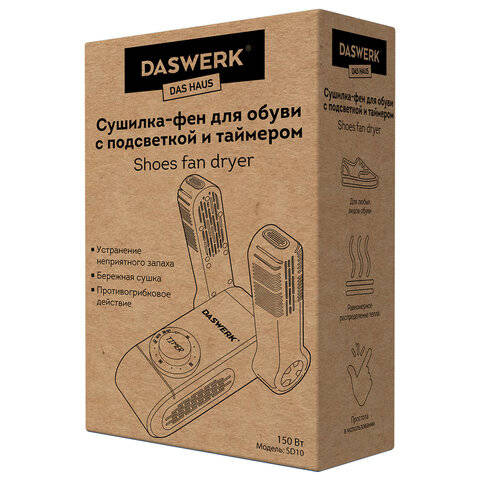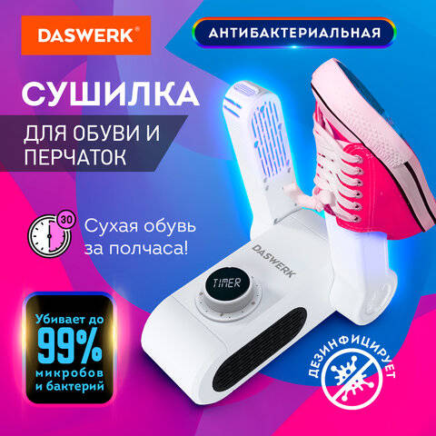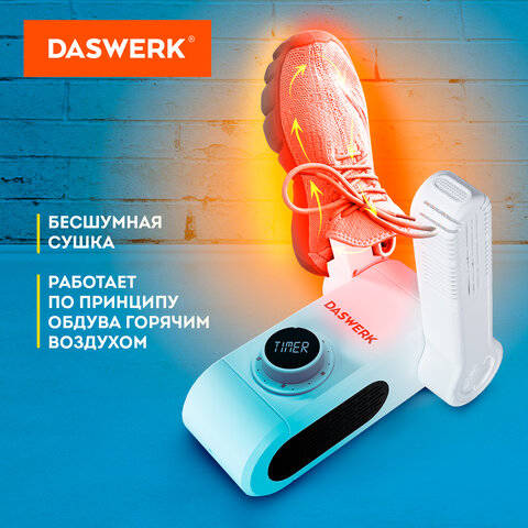 Сушилка-фен DASWERK создана для бережного и безопасного ухода за обувью, перчатками и варежками. Особая технология нагрева уничтожает неприятный запах и дезинфицирует обувь, а эргономичная форма позволяет просушить даже самые труднодоступные места. Сушилка для обуви DASWERK с подсветкой изготовлена из огнеупорного пластика, а нагревательный элемент надежно изолирован, что делает сушилку безопасной в использовании. Тепло быстро распределяется внутри обуви благодаря множеству мелких отверстий и мощному обдуву. Бережно сушит и дезинфицирует обувь не деформируя ее за счёт оптимальной температуры и плавного нагрева.