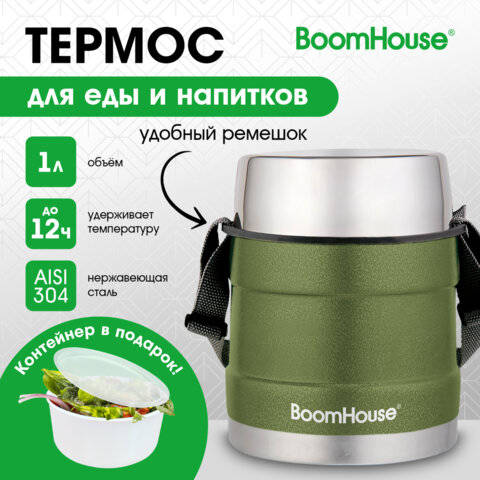 Термос BoomHouse - практичное решение для сохранения температуры еды и напитков до 12 часов! Двойные стенки из нержавеющей стали SUS 304 надёжно удерживают тепло, а широкое горло удобно для первых и вторых блюд. Незаменим в поездках, на работе и отдыхе. Термос BoomHouse выполнен из долговечной пищевой нержавеющей стали SUS 304 и безопасного для здоровья нетоксичного пластика (BPA free). Благодаря качественной вакуумной конструкции с двойными стенками, силиконовым уплотнителям и надежной крышке полностью герметичен и не протекает при использовании. Удержание температуры зависит от условий использования: частота открывания, время нахождения в открытом состоянии, температура окружающей среды, начальная температура наливаемой жидкости.