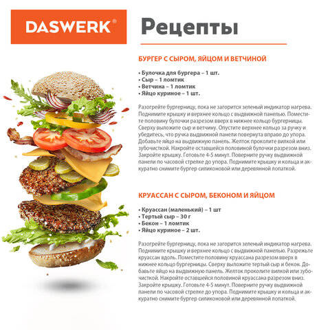 Бургерница DASWERK станет незаменимым помощником на Вашей кухне. С ней Вы сможете легко приготовить бургеры и сэндвичи на любой вкус.